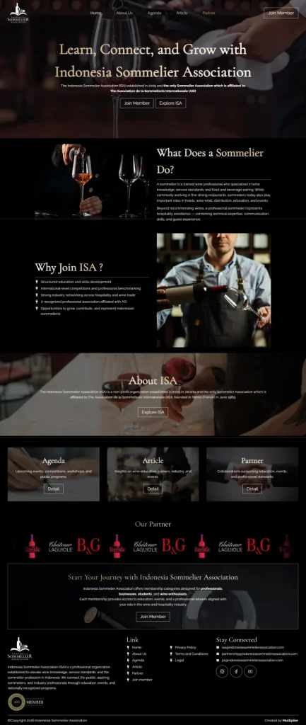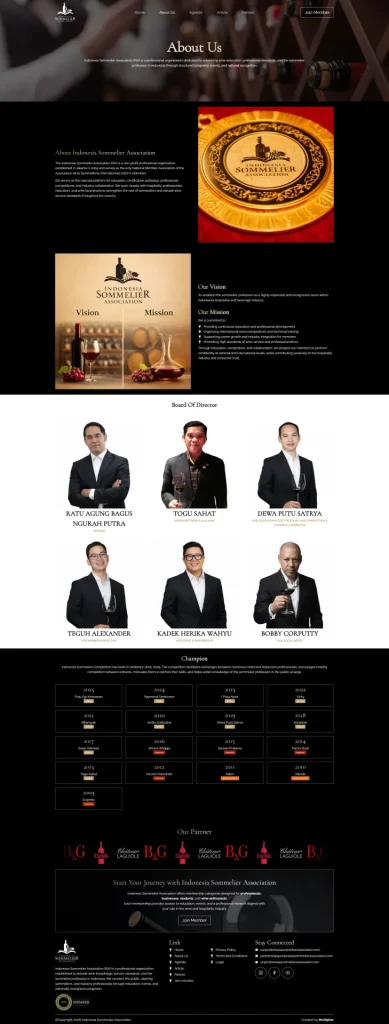 Setelah itu kami mendesign custom setiap page dari nol (scratch), dan juga kami memadukan elemen warna sesuai dengan branding Indonsia Sommelier Association.