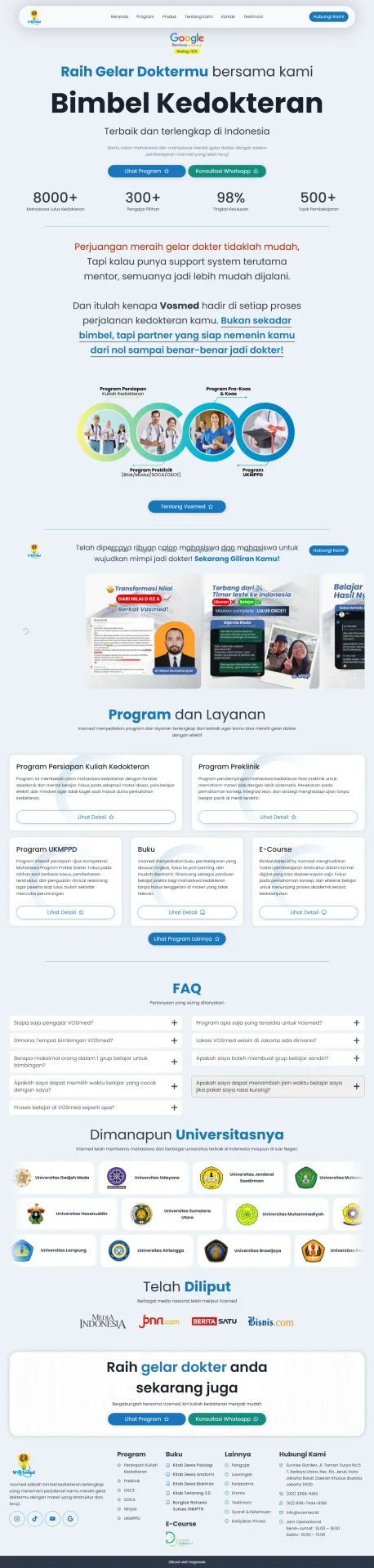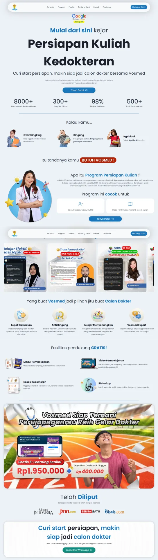 VOSMED bergerak di bidang bimbingan belajar kedokteran dengan target mahasiswa preklinik dan calon mahasiswa baru. Tantangan utama adalah mengonversi traffic dari iklan menjadi lead yang benar-benar tertarik mendaftar, sekaligus membangun citra brand yang premium namun tetap dekat dengan mahasiswa.